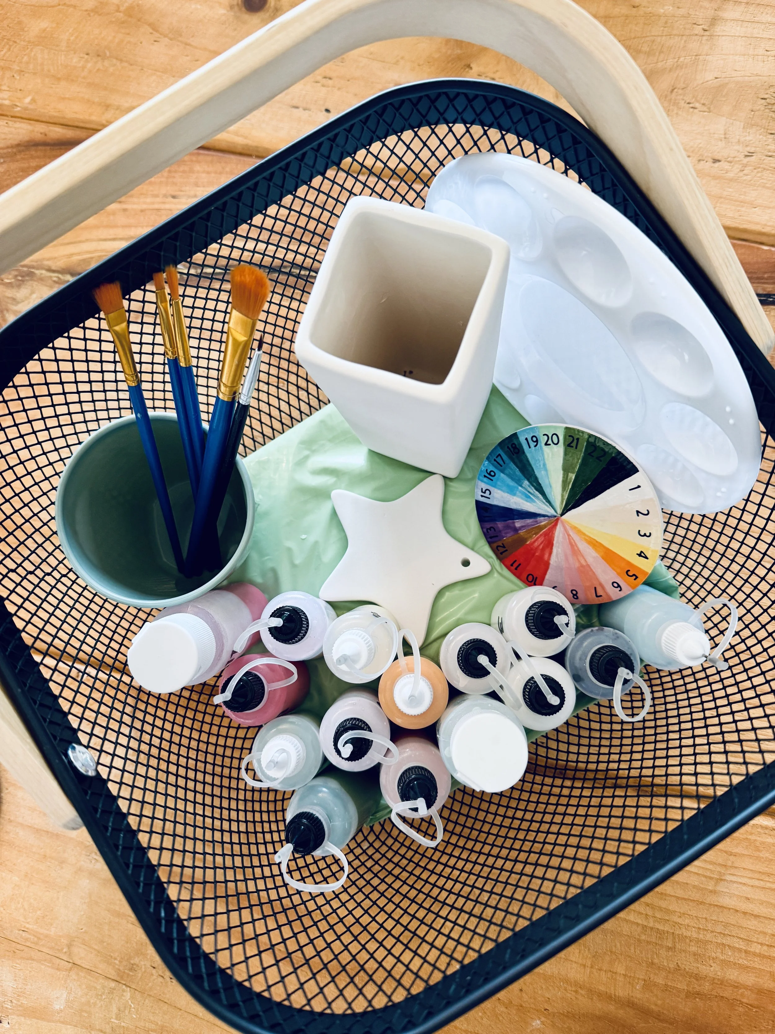 If you would like to paint in the comfort of your own home you can hire a hamper for £5 per week (suitable for 1-2 items). These are ready to go kits that include a colour wheel, a selection of paints, a paint pallet, brushes, a water cup, a printed list of tips and hints a table cloth and of course your chosen pottery.